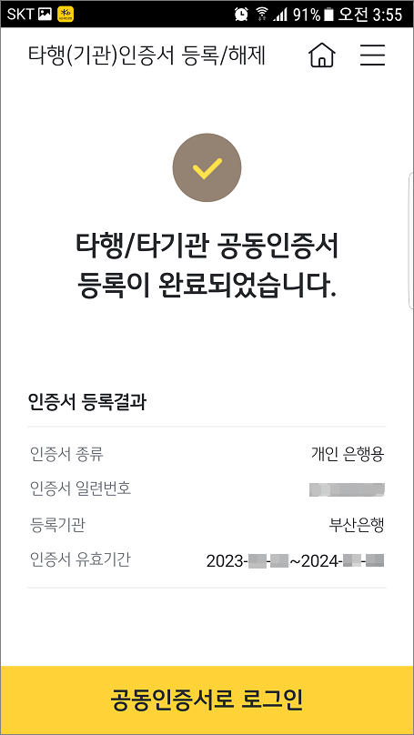 ⑭. 타행/타기관 공동인증서 등록이 완료되었습니다.