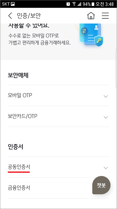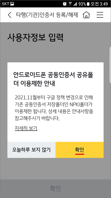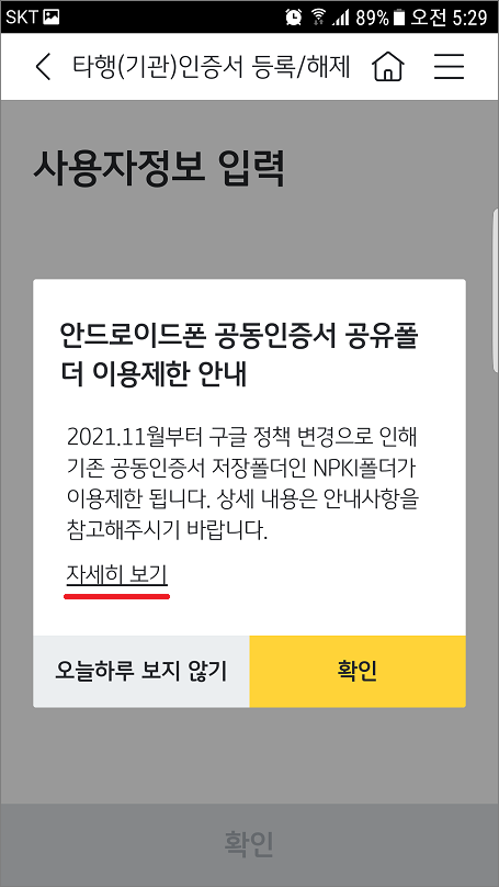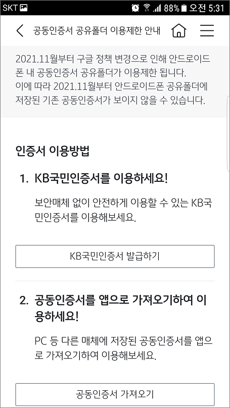 안드로이드 11 사용자는 은행 홈페이지에서 스마트폰 인증서 복사 등의 메뉴를 사용해야 합니다.