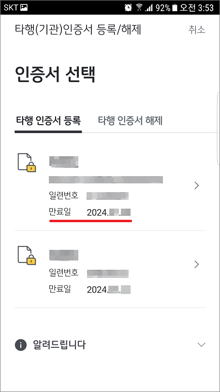 ⑥. 타행(기관) 인증서 등록/해제 선택.