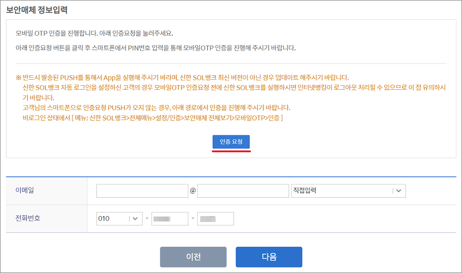①. 신한은행 공동인증서(구 공인인증서) 타인증서 등록/해제할 경우 보안매체 정보입력합니다.
