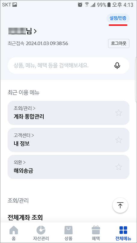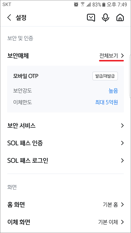 ④. 신한 쏠(SOL) > 전체메뉴 > 설정/인증 > 모바일OTP 선택.