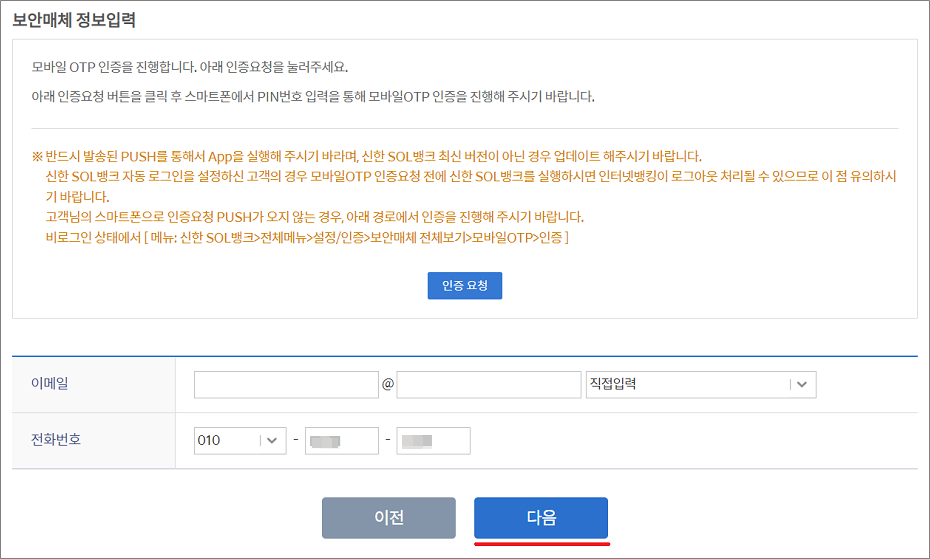 모바일로 이동해서 신한 쏠(SOL)에서 모바일OTP 인증 확인합니다.