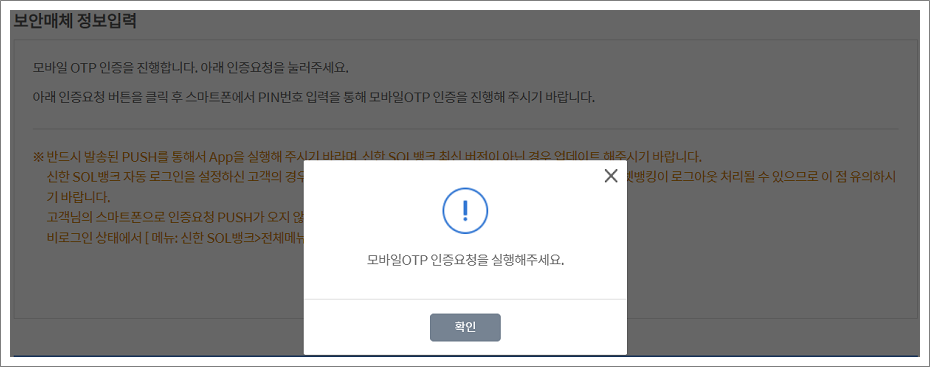 ③. 모바일OTP 인증을 하지 않고 진행하면 에러메시지 나옵니다.