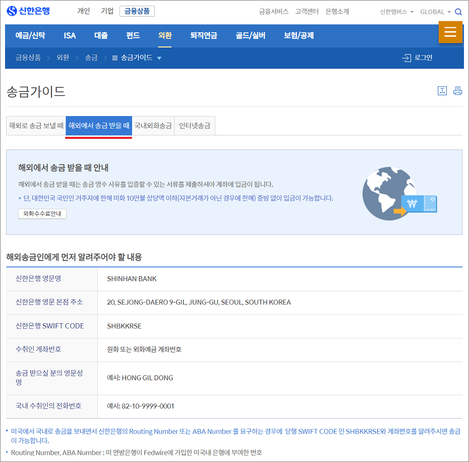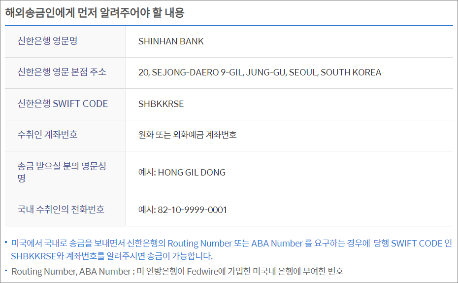 미국에서 국내로 송금을 보내면서 신한은행의 Routing Number 또는 ABA Number를 요구하는 경우에 당행 SWIFT CODE 인 SHBKKRSE와 계좌번호를 알려주시면 송금이 가능합니다.