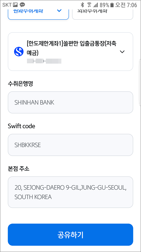 ⑦. 신한은행 수취은행명, Swift code, 본점 주소가 영문으로 표시되어 있습니다.