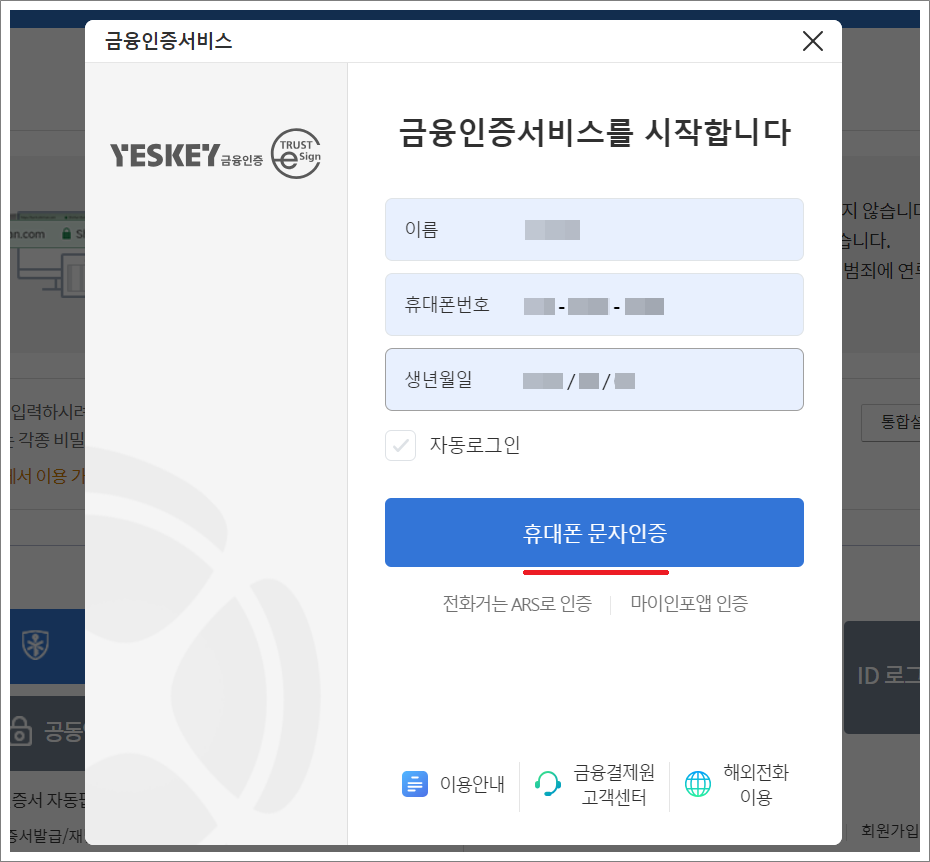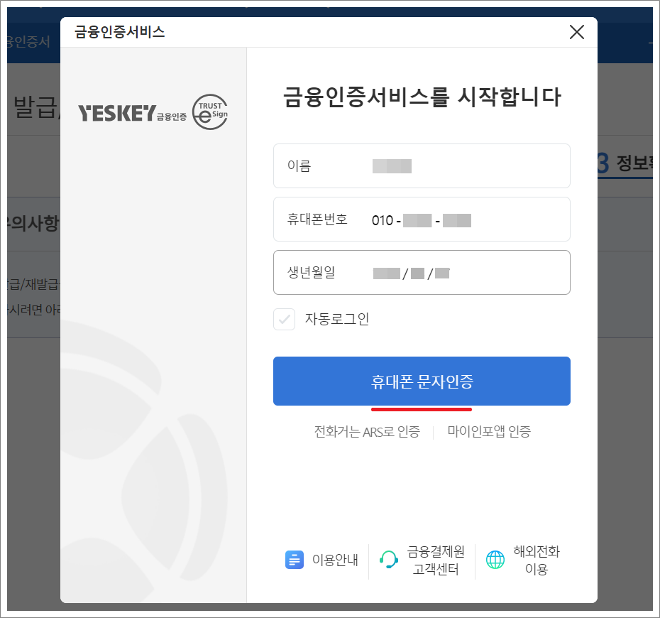 ①. 금융인증서 발급과 사용 방법은 이름, 생년월일, 휴대폰 번호만 있으면 가능합니다.