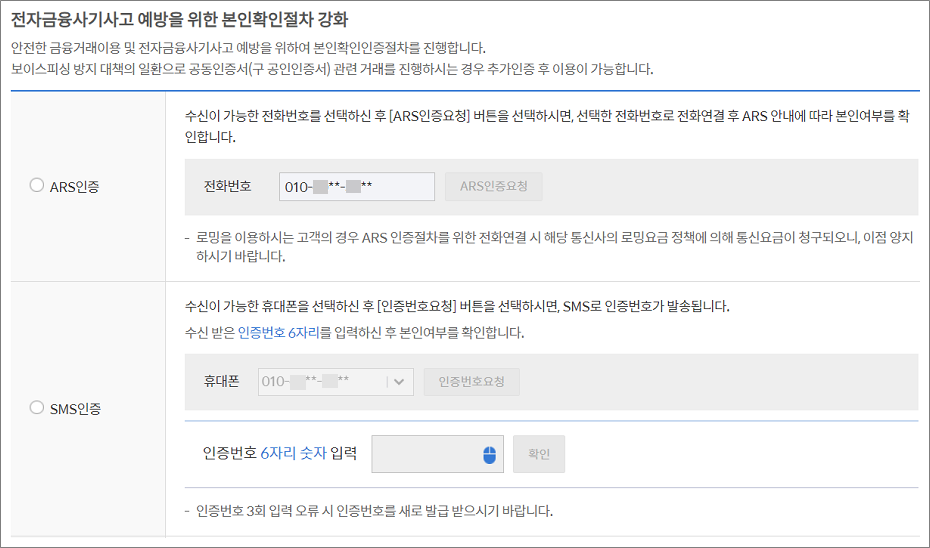 2. 본인확인 절차 강화는 ARS인증 또는 SMS인증 중에서 선택합니다.