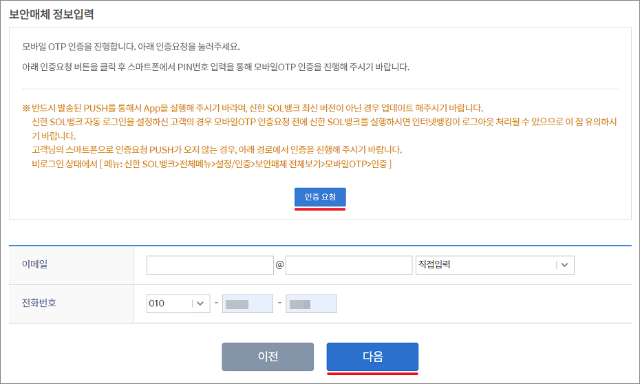 ⑪. 보안매체 정보입력이 완료되면 전화번호를 입력하고 다음을 선택합니다.