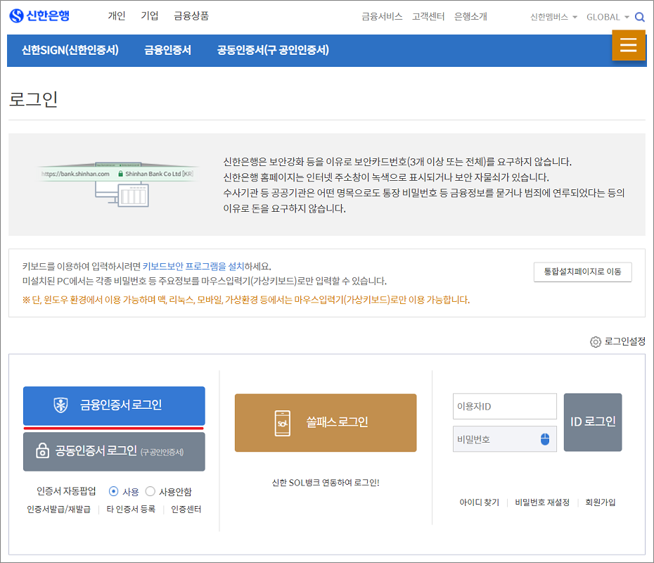 신한은행에서 금융인증서를 발급받을 때뿐만 아니라 로그인할 때에도 보안프로그램 설치는 필수입니다.
