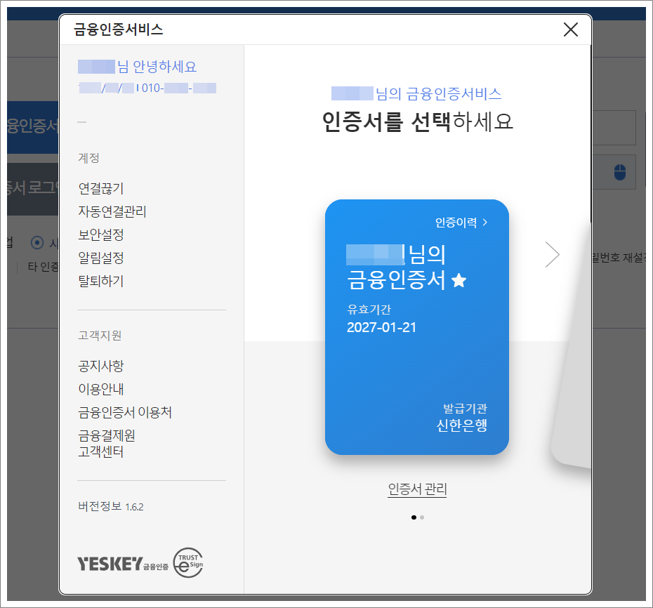 ⑧. 신한은행 금융인증서로 로그인한 화면입니다.