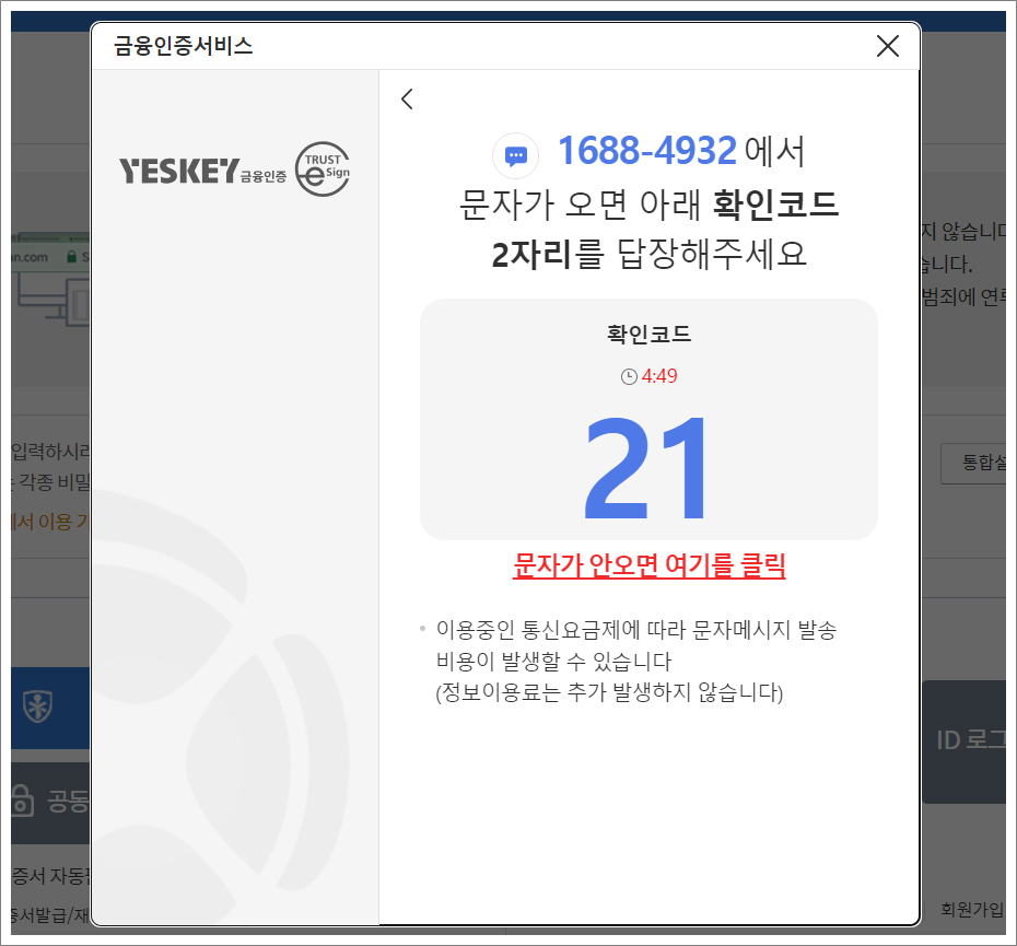 휴대폰 문자 인증 선택합니다.