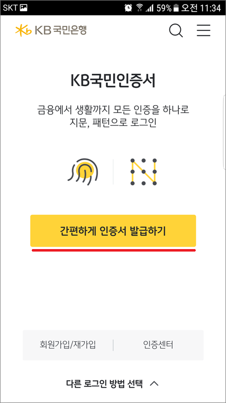 KB스타뱅킹에 지문, 패턴으로 로그인하기 위해서는 KB국민인증서를 발급받아야 합니다.