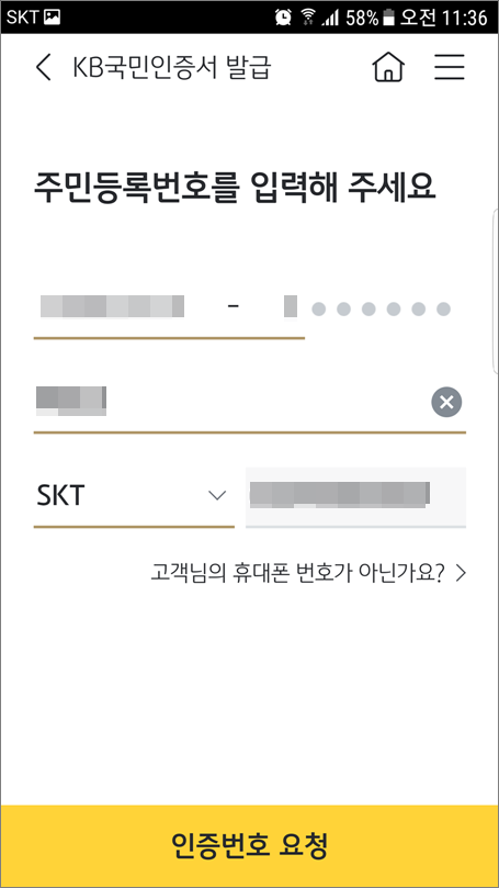 ⑦. 주민등록번호를 입력하고 인증번호 요청 선택합니다.