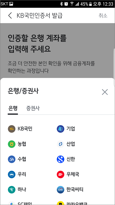 ①. 은행/ 증권사 선택을 합니다.
