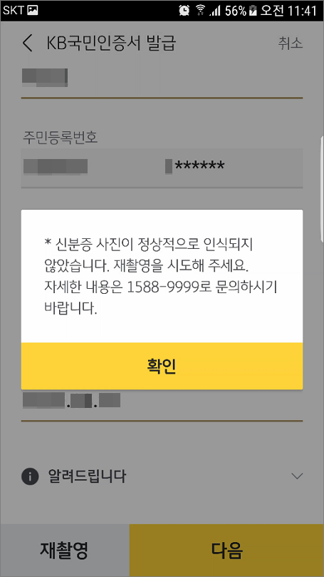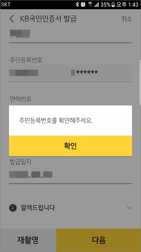 ⑤. 이름, 주민등록번호 등 확인 메시지가 나오면 해당 부분을 수정하면 됩니다.