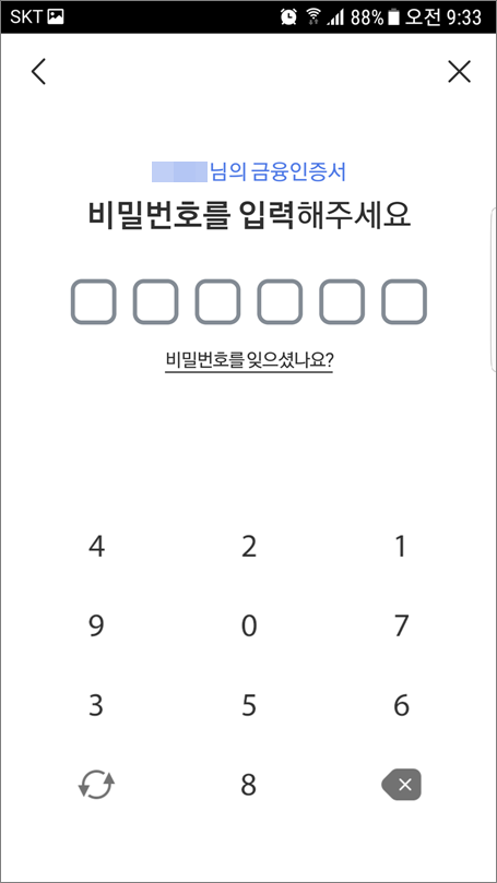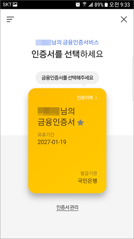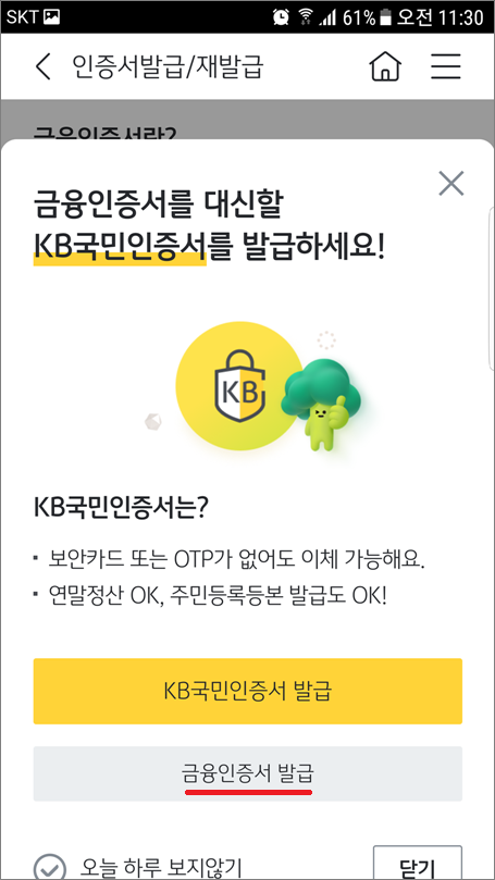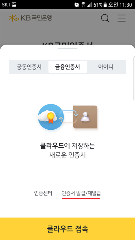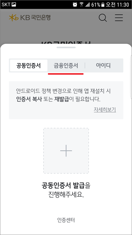 모바일로 금융인증서를 발급받기 위해서는 KB국민은행의 KB스타뱅킹이 설치되어 있어야 합니다.