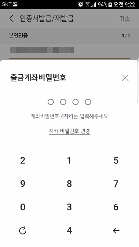 ⑬. 출금계좌비밀번호 4자리, KB국민인증서 간편비밀번호 6자리, KB국민인증서 패튼을 순서대로 입력합니다.