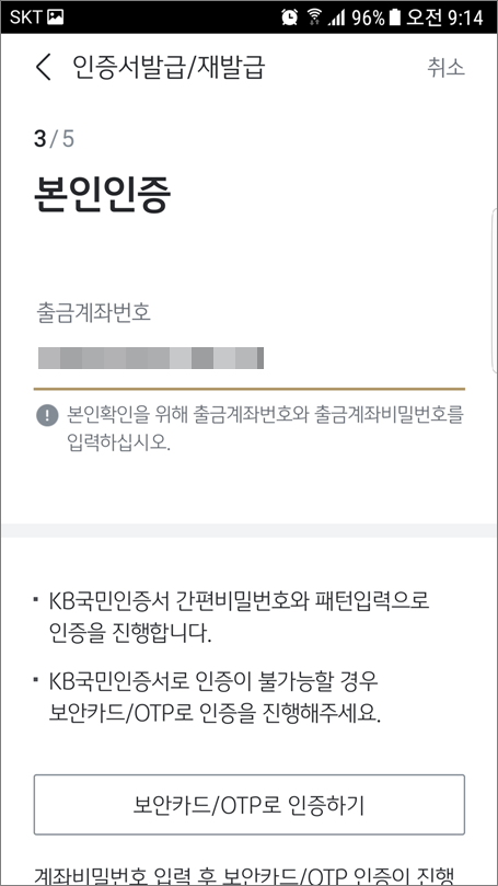PC로 금융인증서를 발급받기 위해서도 보안카드, 실물 OTP가 없는 경우는 모바일 OTP 또는 KB국민인증서를 통해서 인증을 받기 때문에 모바일에 KB스타뱅킹의 설치가 필수입니다.