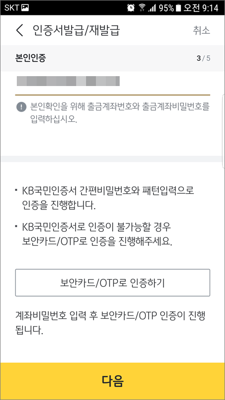 ⑫. KB국민인증서로 인증할 경우 다음을 선택하고 보안카드/OTP로 인증할 경우에는 보안카드/OTP 인증하기 선택합니다.