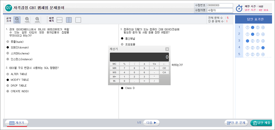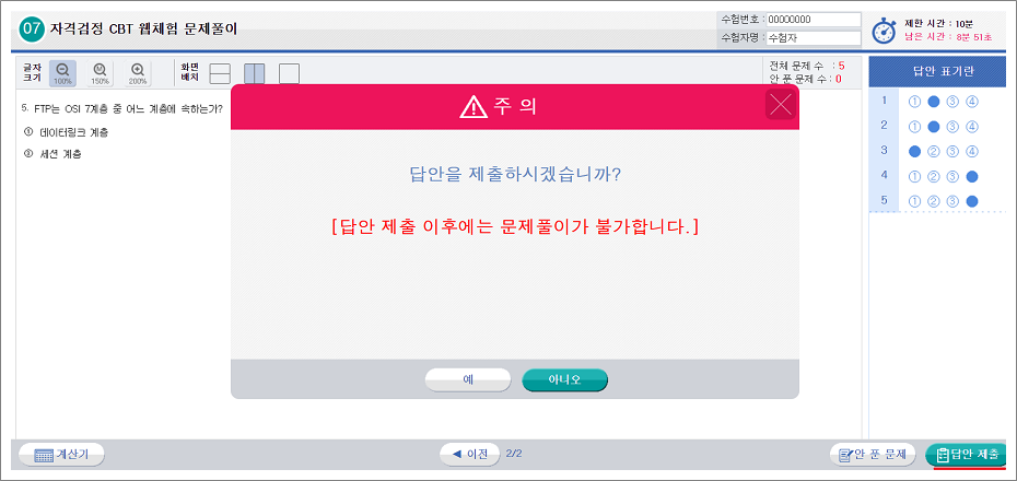 필기시험 전에 CBT시험 방식으로 연습 문제를 풀고 시험을 치릅니다.