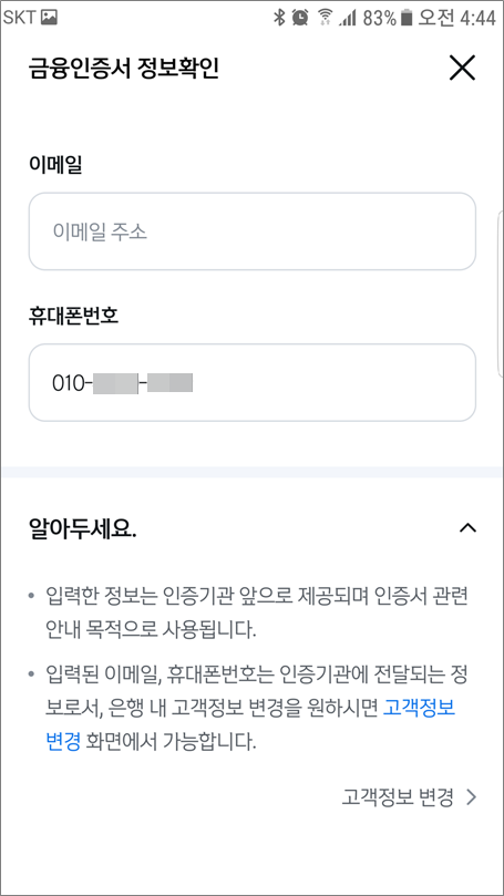 ③. 이메일 혹은 휴대폰 번호 중 1가지 정보는 필수로 입력해야 합니다.