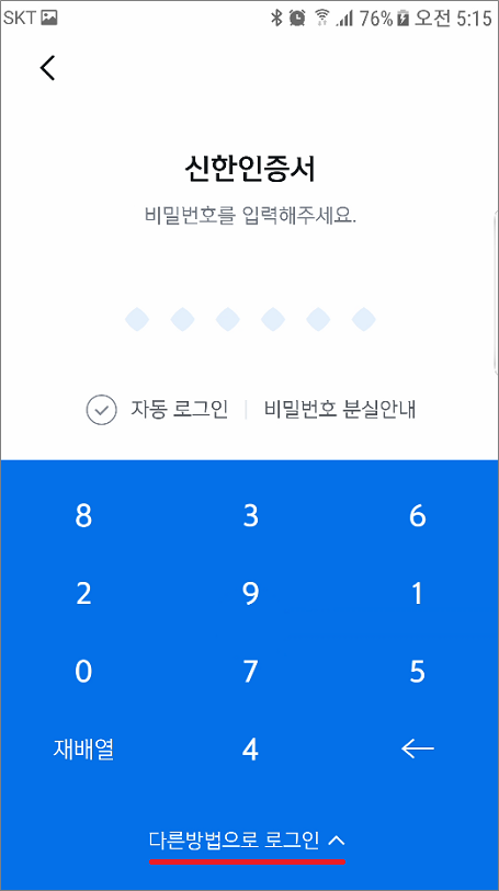 ①. 지문, 패턴, 간편비밀번호 로그인 경우 하단의 다른 방법으로 로그인 선택합니다.