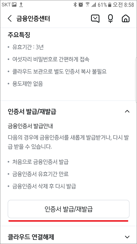 인증서 발급/재발급 메뉴가 안 보이면 하단으로 이동합니다.