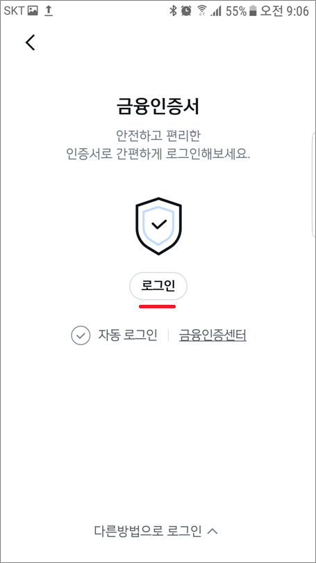 ①. 지문, 패턴, 간편비밀번호 로그인 화면에서는 하단의 다른 방법으로 로그인 > 인증서 > 금융인증서 선택하면 됩니다.