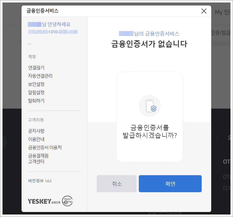 금융결제원 YESKEY에서 이름, 휴대폰 번호, 생년월일만 입력하면 모든 은행의 금융인증서를 삭제할 수 있습니다.