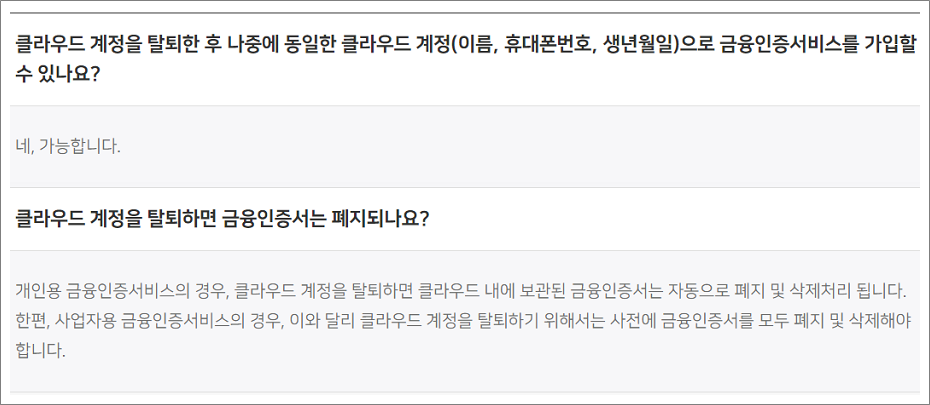④. 금융인증서 탈퇴 또는 클라우드 삭제해도 차후에 금융인증서를 재발급받을 수 있습니다.