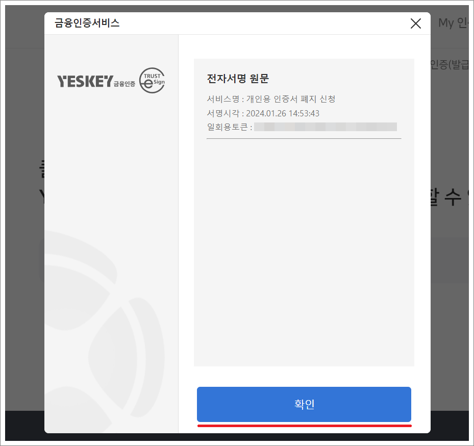 ⑨. 개인용 인증서 폐지 신청 표시가 나오면 확인 선택합니다.