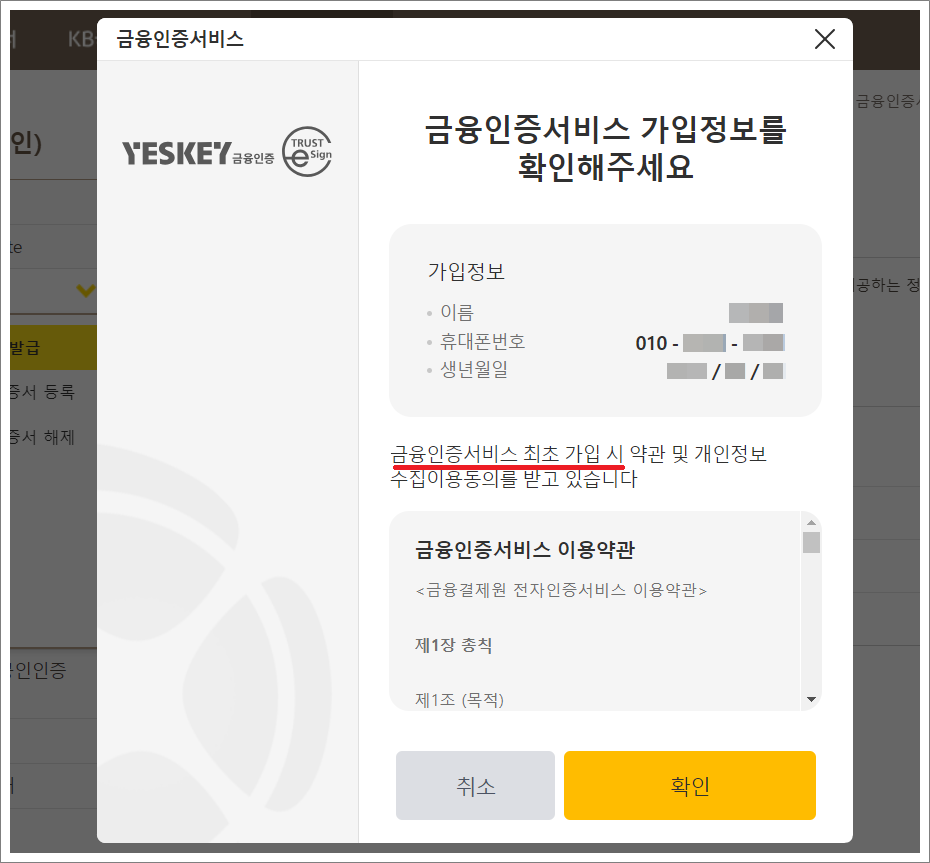 해지와 탈퇴 차이점은 금융인증서비스 최초 가입 시 나오는 이용약관이 나온다는 것뿐입니다.