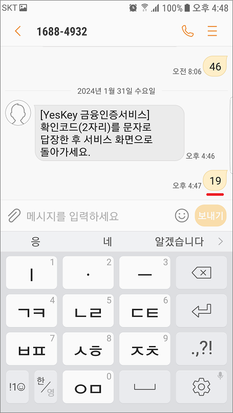 ④. 확인코드 2자리 숫자가 표시되고 문자가 오면 숫자 2자리 입력해서 답장합니다.