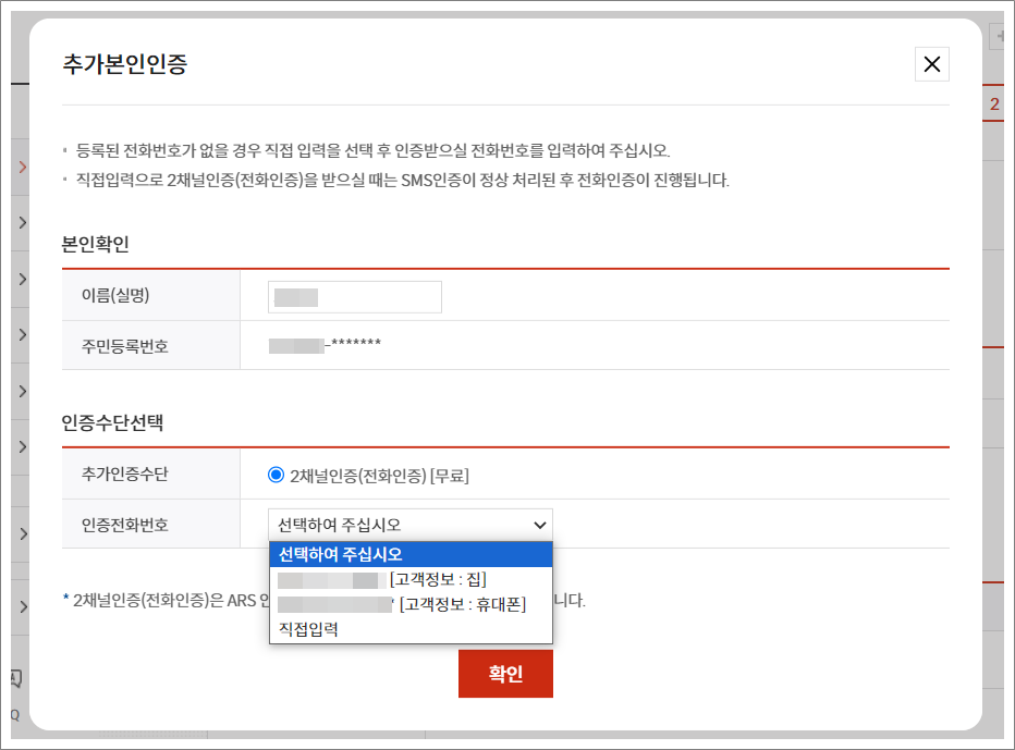 ⑪. 인증전화번호 선택하고 확인선택합니다.