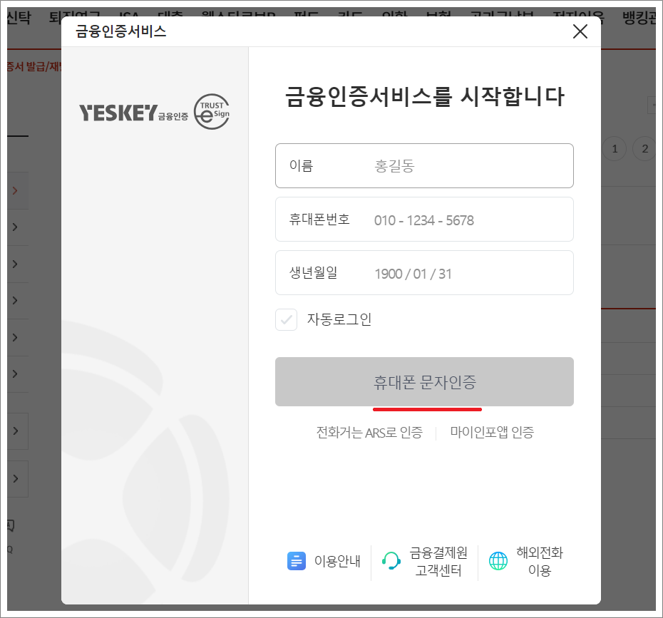 ③. 이름, 휴대폰 번호, 생년월일 입력하고 휴대폰 문자인증 선택합니다.