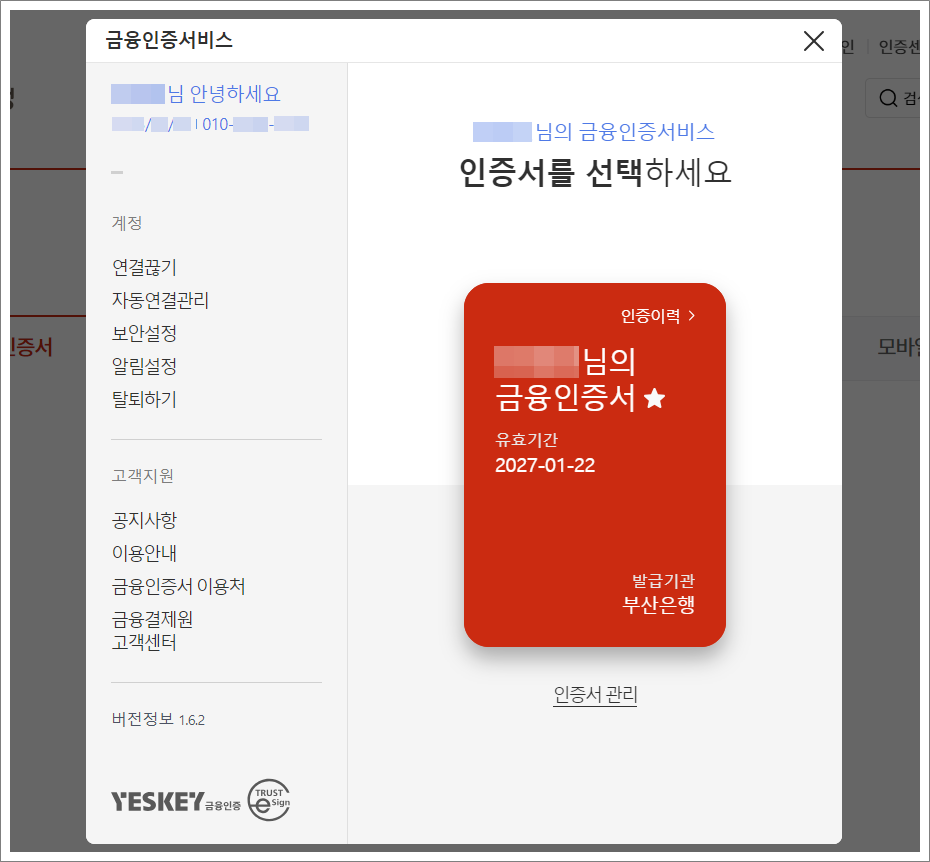 ⑤. 부산은행 금융인증서 발급이 완료되었습니다.