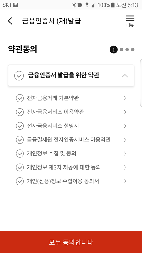 이 부분부터는 금융결제원 클라우드에서 진행되기 때문에 모든 은행의 금융인증서 발급 방법이 동일합니다.