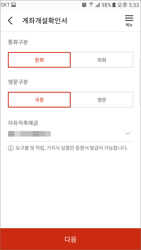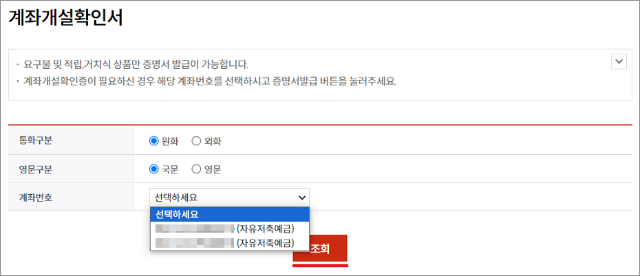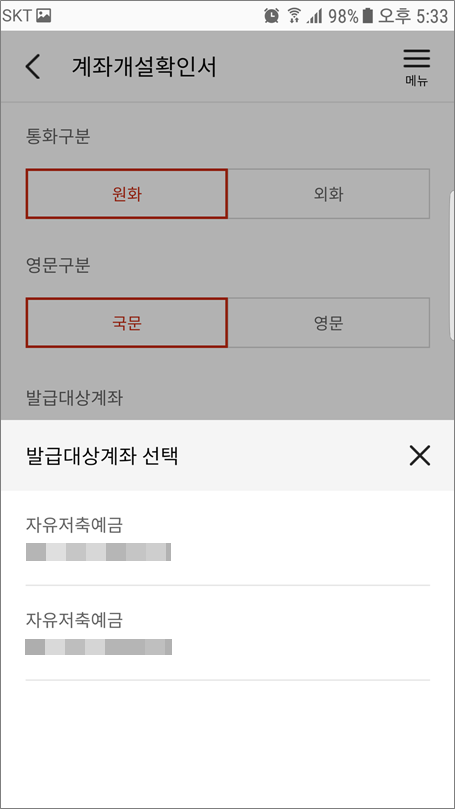 ②. 계좌개설확인서 선택합니다.