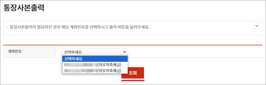⑥. 부산은행 계좌가 2개 이상인 경우는 계좌번호를 선택하고 조회합니다.