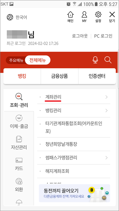 ②. 뱅킹 > 조회.관리 선택하고 하단으로 이동합니다.