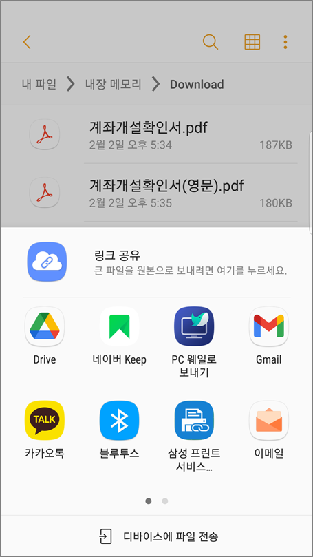 ⑪. 내 파일 > 내장 메모리 > Download 폴더에 통장사본 파일들이 저장됩니다.