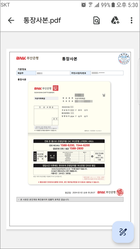 ⑩. 알림창을 선택하면 통장사본.pdf 파일 화면이 나옵니다.
