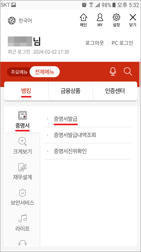 ②. 뱅킹관리 > 증명서 > 증명서발급 선택합니다.