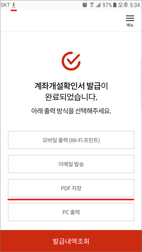 ⑧. 통장사본 발급과 동일하게 PDF 저장 선택하면 알림창에 다운로드 표시가 생기고 알림 내용을 선택하면 됩니다.