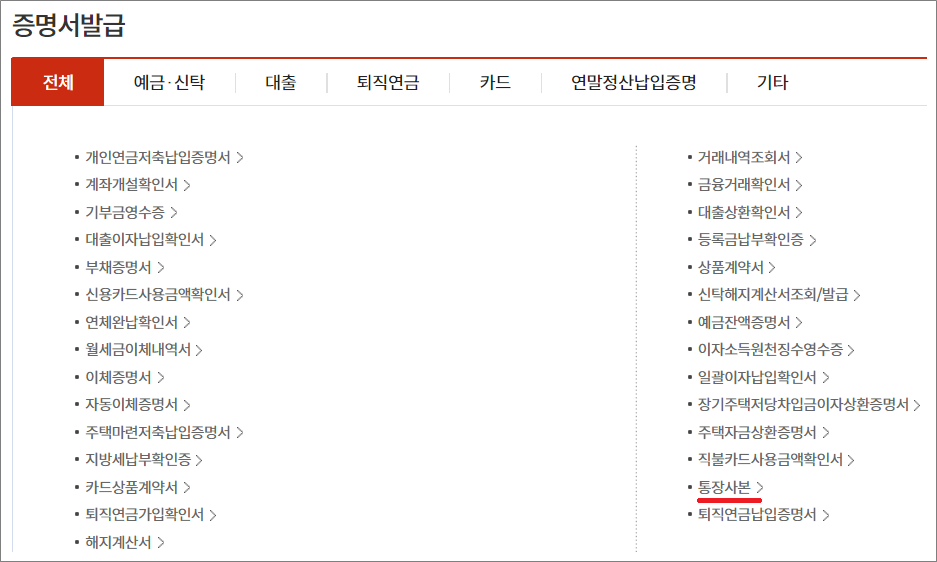 통장사본 발급은 실물 통장과 동일한 모습으로 출력되고 국문만 가능합니다.