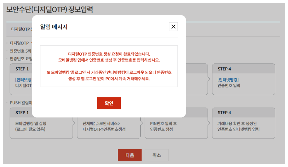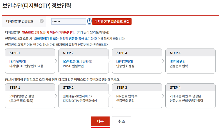 디지털 OTP를 소지하고 있으면 디지털OTP 인정번호 요청 선택하고 모바일에서 인증번호 6자리를 발급받아서 입력하면 됩니다.