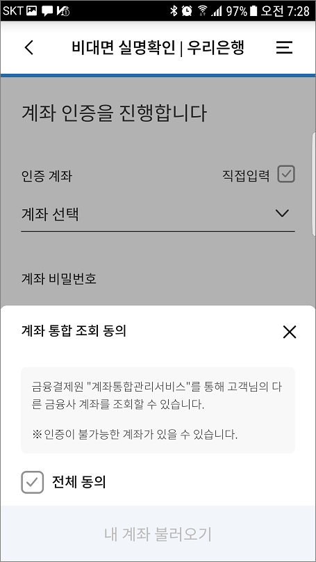 ⑤. 계좌통합관리서비스 메뉴가 나오면 전체동의 후 내 계좌 불러오기 선택하면 됩니다.