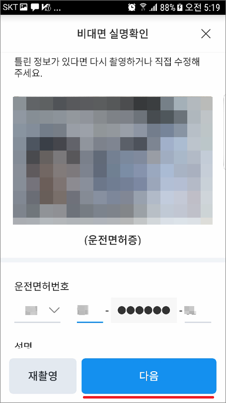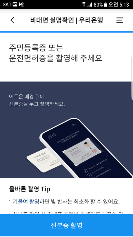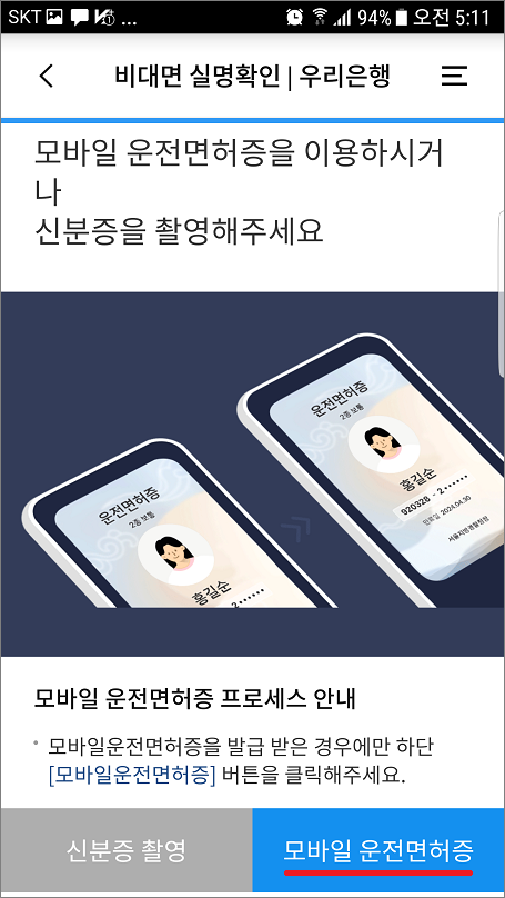 1. 신분증 확인은 신분증 촬영 또는 모바일 운전면허증 인증합니다.