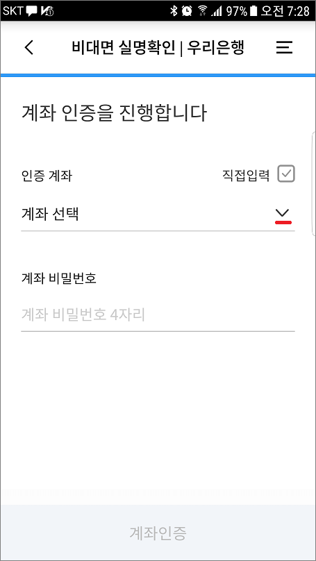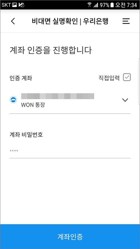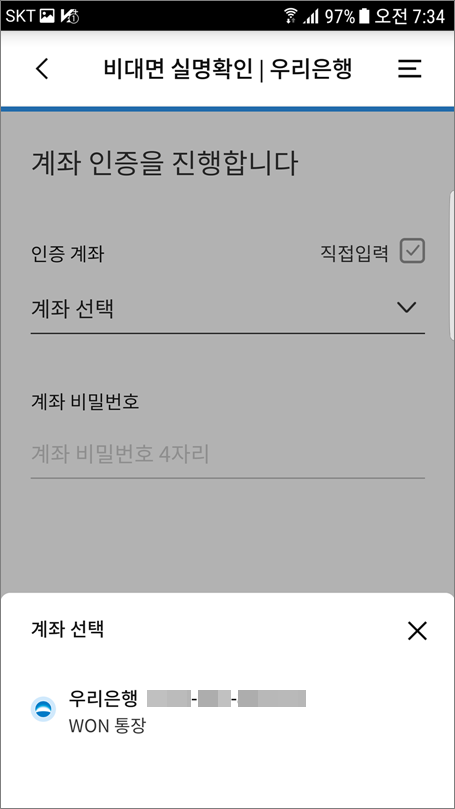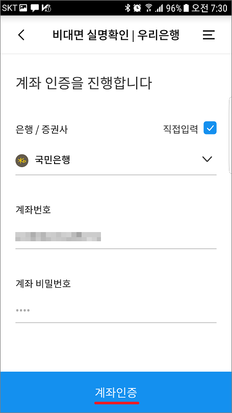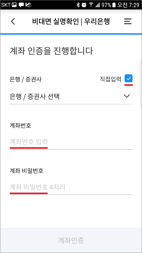 ⑥. 계좌통합관리서비스를 이용하지 않을 경우는 직접입력 체크하고 계좌번호, 계좌비밀번호 입력합니다.
