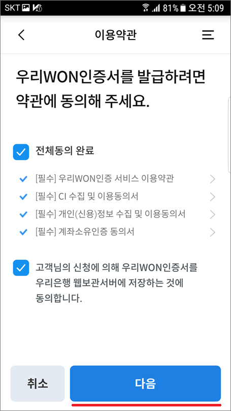 ⑤. 전체동의 체크하고 다음 선택합니다.